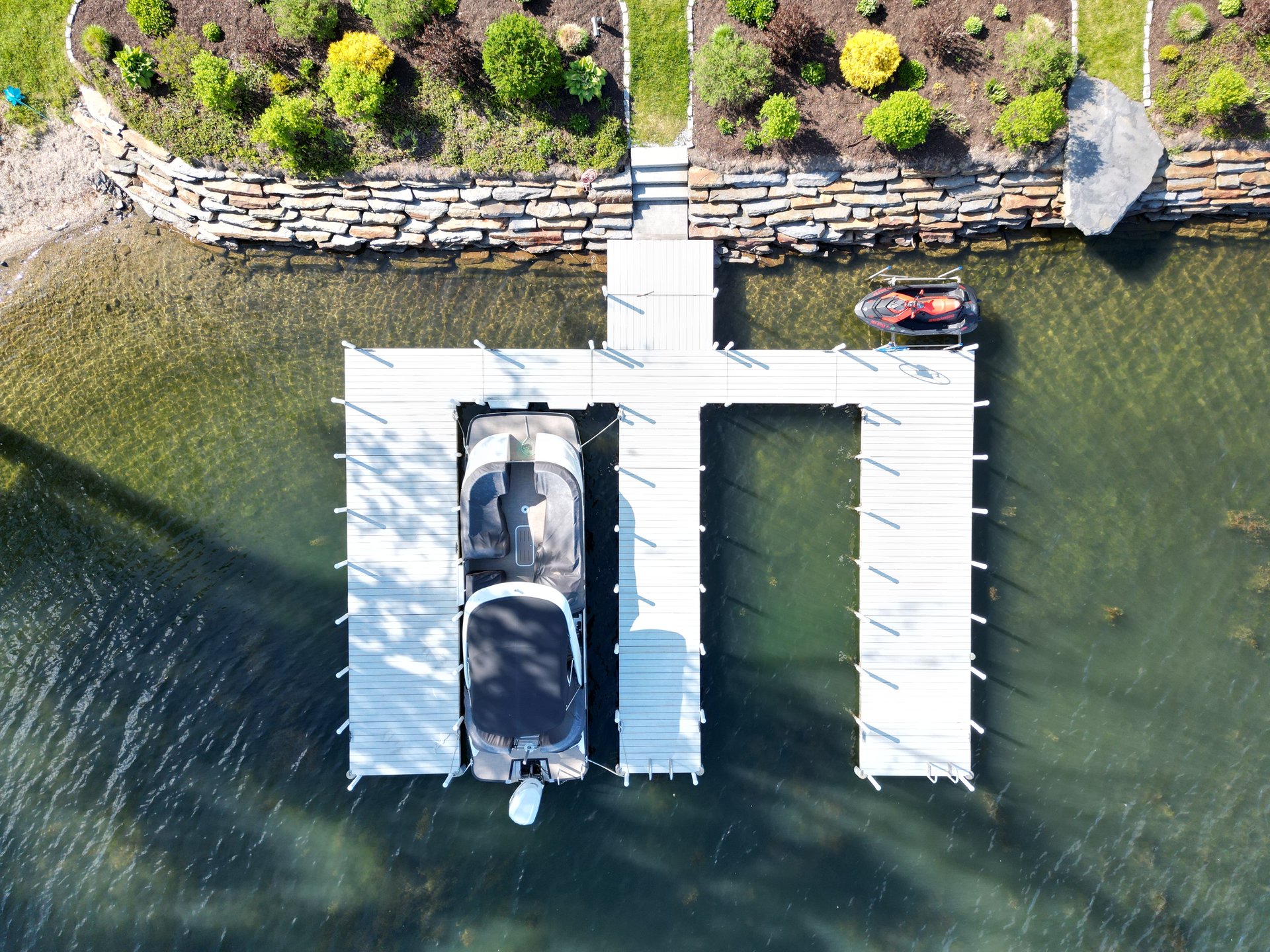 There are plenty of marine decking materials available, but my personal favorite is plastic decking, specifically in a light gray color. Plastic is low maintenance, durable, and long lasting. The color matters more than people think. Light gray does not absorb nearly as much heat as darker tones, which makes a noticeable difference if you like walking barefoot on the dock during hot summer days.